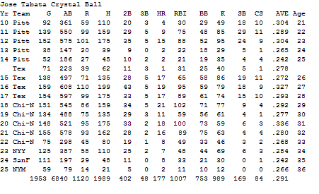 The Crystal Ball is NOT a prediction or formal projection. It is meant to spark discussion about the player in question, in this case Jose Tabata of the Pittsburgh Pirates.